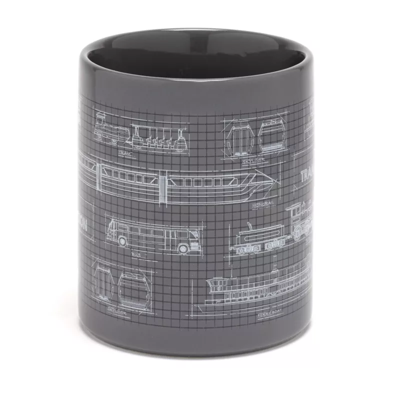 All aboard for teatime enchantment! This quirky mug features sketch-style artwork depicting various Disney transportation.
