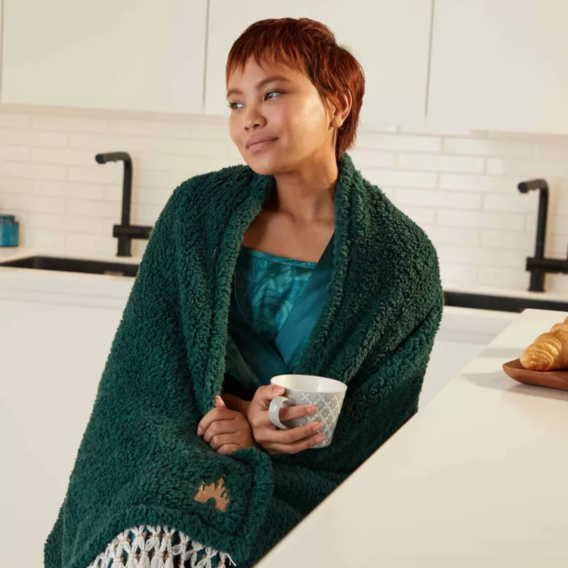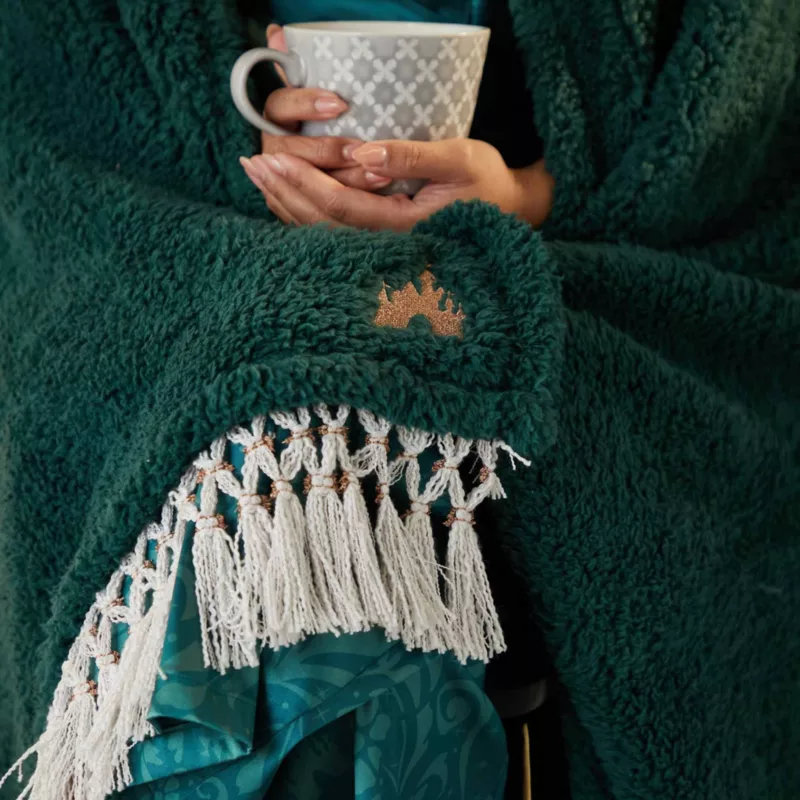 Turn your home into a Fantasyland with this elegant throw. The lush design incorporates a woven golden embroidered Fantasyland Castle icon in the corner and white tassels at the ends.