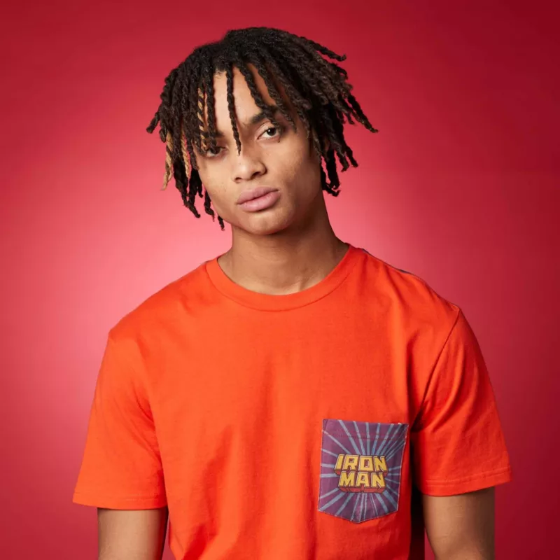 - ‘Iron Man’ wording on front pocket and back of t-shirt