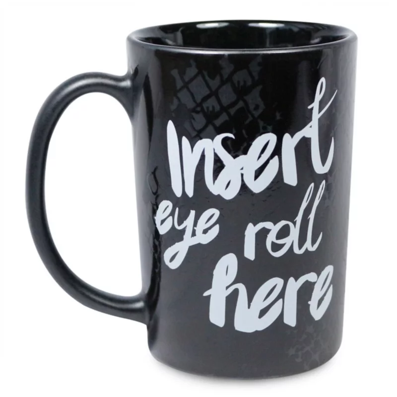 The villainous Jafar from Disney’s animated Aladdin shows his face and his dry sense of humour on this mug. One side of this black ceramic cup pictures his disdainful glare while the other invites you to ”Insert eye roll here.”