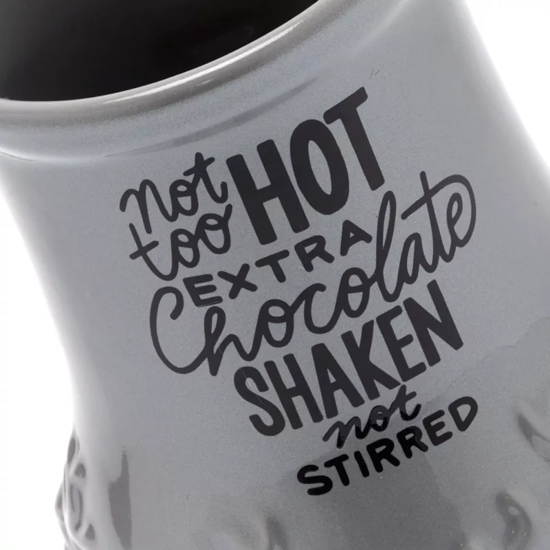 - ”not too hot extra chocolate shaken not stirred” text on front